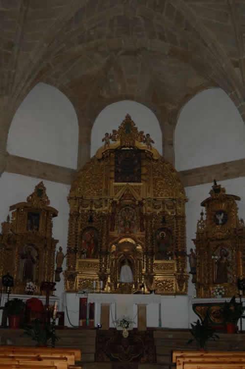 Los retablos son de estilo Barroco, pero de época tardía. El retablo central está compuesto de banco muy peraltado, un solo cuerpo y cierre y consta de tres calles. En el banco o predela aparecen cuatro ménsulas ornamentadas con cabezas de ángeles y motivos florales, ménsulas donde reposan las cuatro columnas. La peralda no es corrida, ya que en el centro se ve interrumpido por el Sagrario, que está envuelto en cuatro columnas y arco de medio punto con dos puertas giratorias y un remate en forma de pequeño casquete esférico, escoltado por dos querubines exentos y de bulto redondo. Rematando el Sagrario hay un arco alabeado. En la parte superior, encontramos la hornacina de la Virgen, con un arco de medio punto que alberga casetones florales y un fondo decorado con pinturas florales en rojo y verde. Las dos calles laterales son simétricas, compuestas de hornacinas sobre casetón floral de medio punto donde se albergan temas escultóricos.
